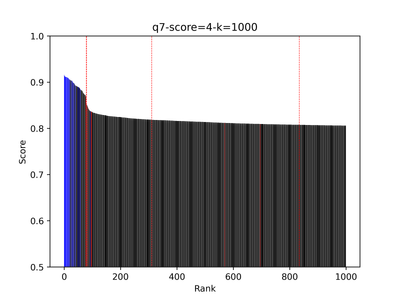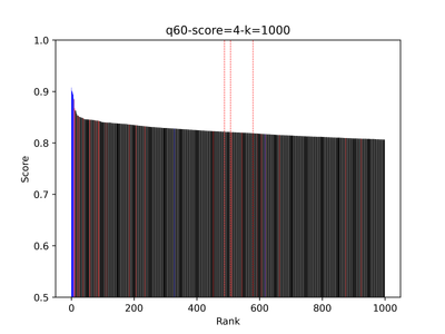 Below is one example - it shows the score value of top 1000 results with the blue color indicating positive, red as negative and black is unannotated; the leftmost dashed red line shows where the cutoff point.