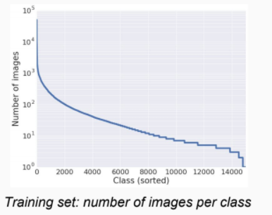 Ví dụ điển hình là tập Google Landmark với 1.5 triệu ảnh, và 15K label (landmark) khác nhau. Hình dưới cho thấy rất nhiều label có số lượng training ít.